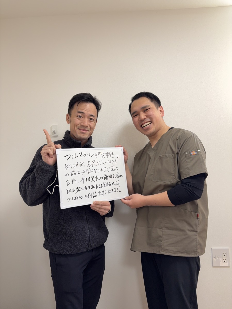 フルマラソンが大好き♥なのですが、右足やふくらほぎの筋肉が固くなりやすく困ってた所、平田先生の施力を受けてとても楽になりました!!目指せ!!