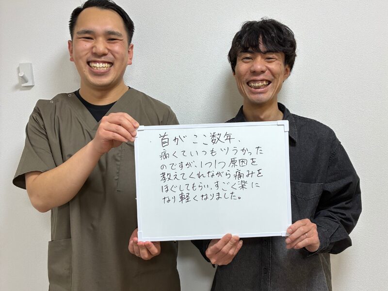首がここ数年痛くていつもツラかったのですが、1つ1つ原因を教えてくれながら痛みをほぐしてもらい、すごく楽になり軽くなりました。